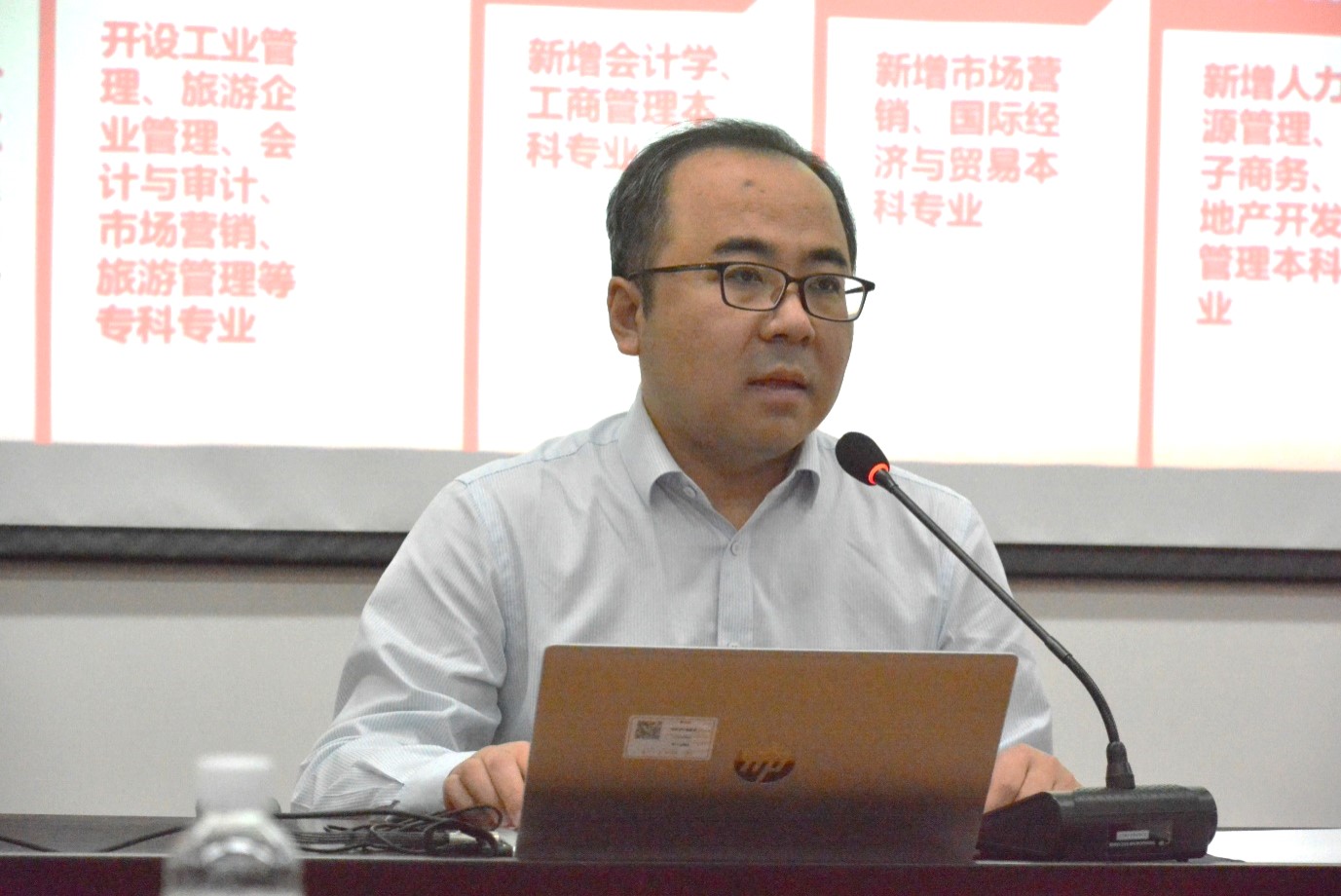 李雷以《坚定信心,认真谋划,团结一致向前进》为题做辅导报告。李雷从硬件设施、文化积淀、师资队伍、优质项目、教育教学、科学研究、社会服务等方面,回顾了学院近40年的奋斗史以及积累的优质资源和来之不易的成绩。随后,李雷围绕四个十分难得的机遇、四个必须直面的挑战、四个多年积累的优势、四个需要弥补的短板,剖析了学院当前面临的机遇和挑战,在此基础上,对学院后续工作进行了谋划。李雷指出,学院将始终深入贯彻落实党的教育方针,秉持突出学科属性,突出使命引领,突出行业特色,突出学科交叉的办学理念,遵循新商科+学校传统优势特色学科”的发展策略,以党的建设为引领,以奋斗者为根本,以工商管理学博士点申报建设为中心,以人才培养和科学研究为基本点,以一流合作和一流保障为支撑,全面落实立德树人根本任务,在服务广西重大战略、推动广西创新发展、传承广西优秀文化等方面真正有所作为。