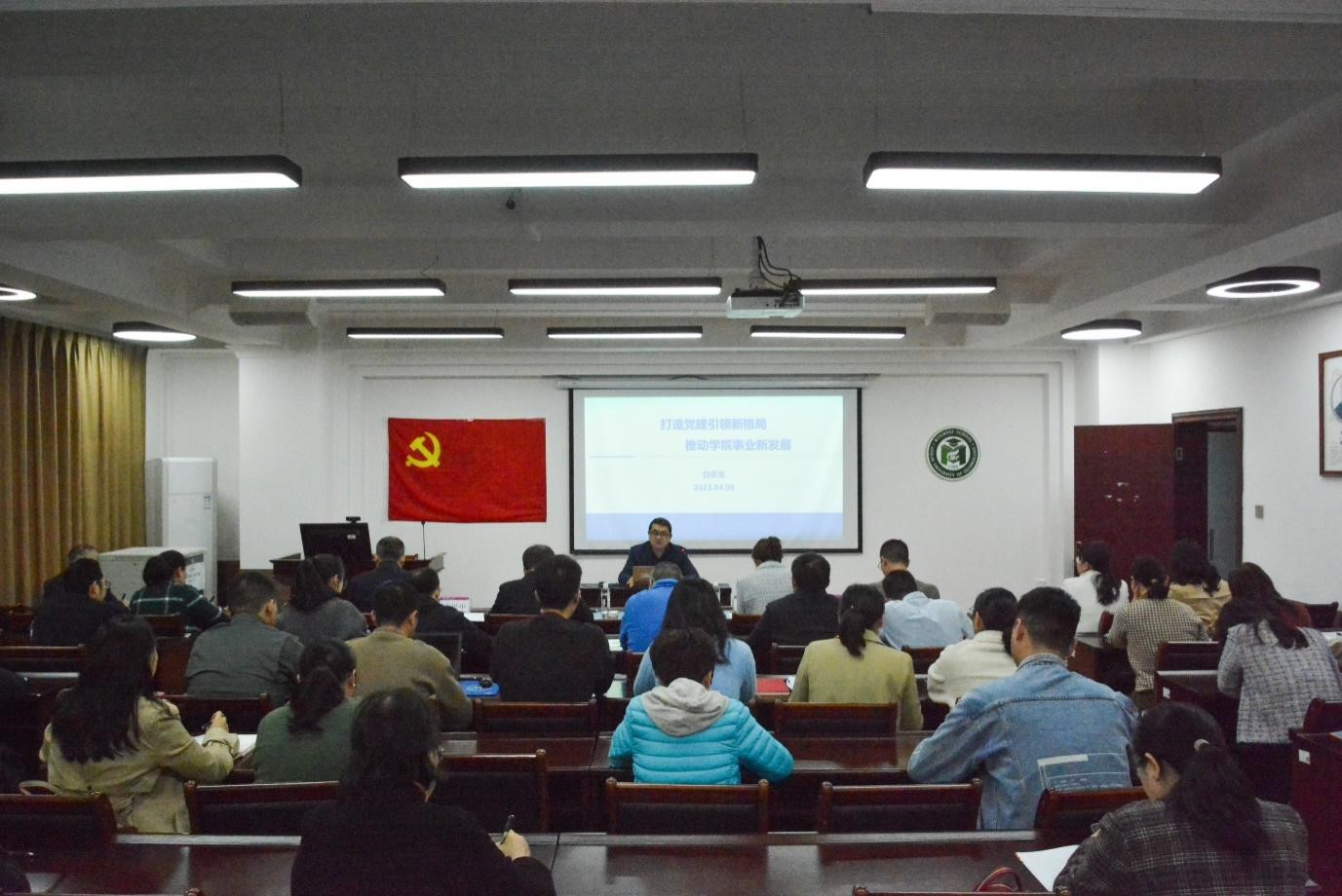 随后,白永生以《打造党建引领新格局,推动学院事业新发展》为题作报告。白永生详细传达了学校第三届党委第五次全体(扩大)会议和2023年工作布置会、安全稳定工作会议、宣传思想工作会议等会议精神,以及邓军书记在学校处、科级干部学习贯彻习近平新时代中国特色社会主义思想和党的二十大精神专题研讨班开班式暨首场报告会上的讲话精神。白永生指出,要提高政治站位,切实增强用党的二十大精神和习近平总书记重要讲话精神武装头脑的思想自觉、政治自觉、行动自觉,进一步增强铆足干劲攻坚克难的精气神;要重视学习转化,把党的二十大精神和习近平总书记重要讲话精神贯穿到人才培养、科学研究、社会服务和文化传承创新全过程,推动学院产出更多高质量成果。白永生强调,要紧紧围绕学习贯彻党的二十大精神这条主线,深刻领悟“两个确立”的决定性意义,不断增强“四个意识”、坚定“四个自信”、做到“两个维护”,强化学院党委政治功能,全力以赴贯彻落实学校2023年工作布置会上强调的十方面重要工作和“八大工程”,将思想共识转化为谋划学院高质量发展的具体行动,努力在夯基垒台、品牌培育、形象塑造、能力提升四个方面下大功夫,塑造学院发展的新优势新动能新赛道。