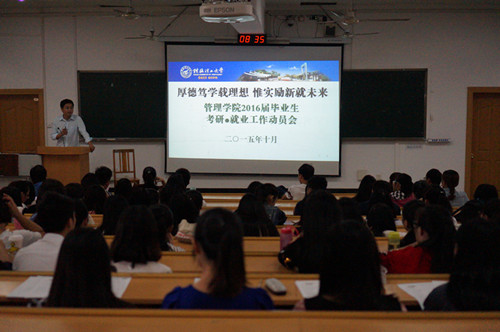 10月16日,我院在屏风校区教九楼分三场为我院707名2016届毕业生召开考研·就业工作动员会。本次动员会的主题为“厚德笃学载理想 惟实励新就未来”,旨在鼓励我院2012级本科生通过考研、出国等方式继续深造,坚定信心、从容面试,进一步提升学院人才培养水平和就业质量。我院党委副书记张瑞,辅导员李业正、曾丽萍老师出席了本次动员会。