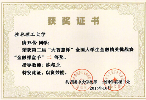 近日,从第二届“大智慧杯”全国大学生金融精英挑战赛组委会处传来喜讯,我院学生在比赛中取得优异成绩,陆珏伶等4名学生获得全国高校金融操盘手二等奖,蕫慧峥、梁华作、冼学宁等34名学生获得全国高校金融操盘手三等奖。
