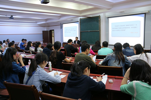 张小成博士在许多知名期刊发表过高质量学术文章,对于学术论文撰写及发表方面具有丰富的实践经验。张老师在简洁的开场之后,直奔主题,以“时间是最稀缺的资源”为引言论述充分利用和把握时间的重要性,利用“二八法则”、杯子理论等原理告诫研究生必须要管理和运用两年的宝贵时光。接着,他强调了研究生期间必须要做好的两件事:修完专业课程和发表学术论文,并结合自身学术研究给同学们传授撰写论文的方法和技巧。整个讲座过程中,张老师旁征博引,语言风趣幽却又不失严谨,赢得在场同学阵阵热烈的掌声。