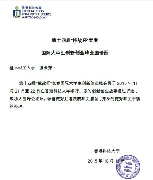 11月21-22日,国际大学生创新创业峰会在香港科技大学举行,我院房地产经营与管理12-2班凌亚萍同学作为广西区唯一学生代表应邀参加了此次峰会。本次峰会是第十四届“挑战杯”中航工业全国大学生课外学术科技作品竞赛的系列活动之一,主题为“青年大学生创新创业能力的培养”,有来自内地70多所高校,5个省级团委的近200名师生赴港参与,峰会收录优秀师生论文近160篇,此外,还吸引了来自香港地区及国际各高校近200名学生参加。