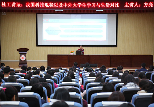 为提升学生科技创新意识、改善学习生活方式,1月6日晚,我校科技处处长方亮教授应我院邀请做客“桂工讲坛”,在雁山校区图书馆报告厅为我院2015级本科生作了题为“我国科技现状以及中外大学生学习生活对比”的专题讲座。讲座由我院党委副书记张瑞主持,2015级辅导员柴靓老师及各班学生代表参加了此次讲座。