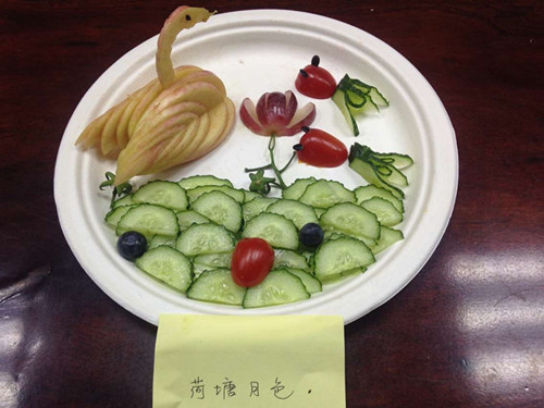 在果皮连连连环节,路立敏老师代表会计系率先上场,苹果皮削得又快又薄又长,获得了单项第一名,优先选到了黄瓜、圣女果等拼盘素材。在水果串串串环节,李达老师第二个上场,水果串串得又快又匀。肖彦、蒋梅芳等4位老师共同负责吃水果串,获得了此项比赛第二名,优先选到了西瓜、葡萄等拼盘素材。在快刀切水果环节,会计系老师一起集思广益,想到了横竖结合的快速切果法,由经验丰富行动迅速的路老师主刀,再一次夺得了此单项第一名。又抢先选到了哈密瓜、龙眼等素材。集齐创意拼盘比赛环节的各素材后,在全系女老师的精心策划、设计和制作下,又一次抢先在规定的时间内完成了“热带风情”与“荷塘月色”两个水果拼盘,其中“荷塘月色”以巧妙的构思,多变的色彩,精细的立体制作等特色,赢得全院唯一的一个水果拼盘一等奖。