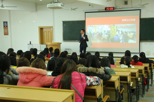 为增强学生对企业的了解,适应企业的用人需求,加深校企合作,桂林彰泰实业集团开发有限公司营销经理冯玉捷先生应我院房地产经营管理教研室邀请,于3月18日下午,在屏风校区为房地产开发与管理专业的2013和2014级全体本科生召开了一场别开生面的宣讲报告会。本次宣讲报告会由房地产经营管理教研室何里文老师主持。