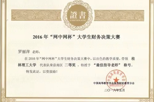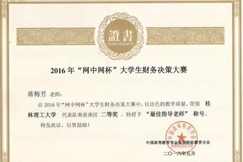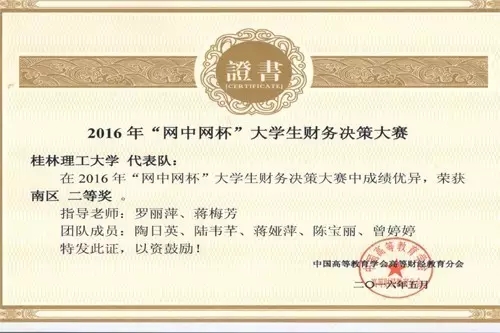2016年5月29日,2016年度全国“网中网杯”大学生财务决策大赛圆满落幕。大赛由中国高等教育学会高等财经教育分会主办,厦门网中网软件有限公司、厦门网中网财务技术有限公司联合承办,共分六个大区。其中南区包含福建、广东、广西、海南、江西五个省区的高等院校。在罗丽萍、蒋梅芳老师指导下,我院会计专业学生陶日英、陆韦芊、蒋娅萍、陈宝丽、曾婷婷五位学生代表学校参加比赛,取得南区二等奖的好成绩,在广西参赛高校中排名第一。同时,两位指导老师被授予“最佳指导老师称号”