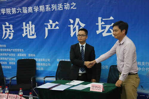 为了使广大房地产相关专业的学生掌握我国房地产行业未来的发展趋势,明确就业方向和实践能力,提高个人专业素养和就业竞争力,2016年5月28日下午,由学院主办、房地产经营管理系承办的第六届“商学期”系列活动之“房地产论坛”于屏风校区9501教室隆重举行。此次房地产论坛是学院学生活动品牌项目“商学期”的子活动。学院党委副书记张瑞、桂林房地产协会会长申应林以及来自房地产行业的9家知名企业嘉宾出席了本次活动。本次论坛活动分为主题演讲、“去库存背景下——房地产营销之道”主题沙龙、校企实习基地签约仪式和企业宣讲四个环节。学院党委副书记张瑞在开场致辞中提出,希望通过本次论坛,学院与企业嘉宾、老师和同学们的共同探讨解决房地产专业如何走向、人才培养怎样实施,教学改革怎样推进等问题。
