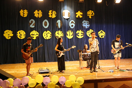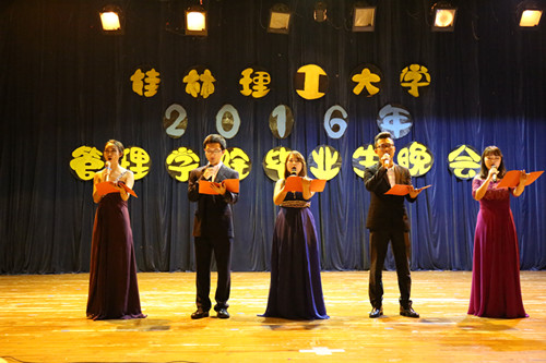 随后,由12级毕业生带领的跳伞塔乐队带来的歌曲《广西山歌大联唱》正式拉开晚会帷幕,接着,舞蹈、朗诵、钢琴独奏、情景剧等节目也接踵而至。国贸、营销第二党支部带来的情景剧《理工,我们的大学时光》带领毕业生们回顾了大学四年的美好时光,毕业生们表演的舞蹈《我们约好了一起跳广场舞》、诗朗诵《惜别桂工,相约十年》、歌曲《十年》、《好久不见》等节目表达了毕业生对母校的依依不舍之情,现场掌声不断,高潮不断。同时,现场四段《大学时光》的视频贯穿整场晚会,勾起毕业生对大学生活的无尽回忆,现场温情不断,感动不断。晚会末尾,毕业生们互送明信片、互道珍重,用歌声、拥抱、合影去惜别四年的同窗和恩师,礼堂内既有毕业的快乐,又有不舍的师生和同窗情谊,礼堂变成了一片温暖欢乐的海洋。