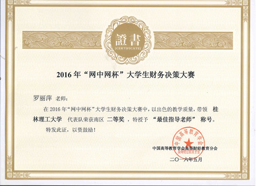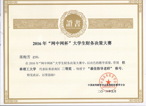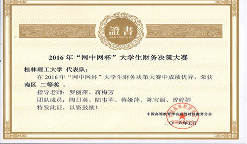 由中国高等教育学会高等财经教育分会主办,厦门网中网软件有限公司、厦门网中网财务技术有限公司联合承办的2016年度“网中网杯”大学生财务决策大赛于2016年5月29日圆满结束,全国分六个大区进行,南区大赛覆盖了福建、广东、广西、海南、江西五个省区的高等院校。我院会计专业学生陶日英、陆韦芊、蒋娅萍、陈宝丽、曾婷婷五位学生代表学校参加了比赛,在罗丽萍、蒋梅芳老师指导下,取得南区二等奖,广西参赛院校中排名第一。两位指导老师被授予“最佳指导老师称号”。