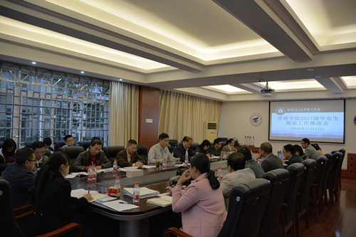 为进一步做好2017届毕业生就业工作, 11月1日下午,学院在7206会议室召开2017届毕业生就业工作推进会,学院院长连漪、副院长江晓云、副院长蒙永亨、党委副书记张瑞、学院各专业教研室主任、学院各党支部书记出席会议,会议由学院党委副书记张瑞主持。