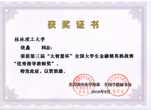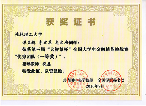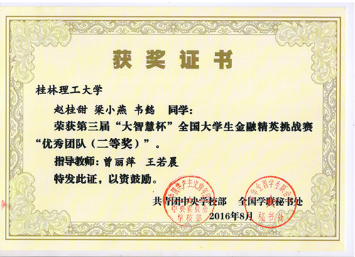 近日,由共青团中央学校部、全国学联秘书处主办,全国学校共青团研究中心协办,上海大智慧股份有限公司承办的2016年第三届“大智慧杯”全国大学生金融精英挑战赛落下帷幕。我院学生在比赛中取得优异成绩,有3支团队获得大赛一等奖,5支团队获得大赛二等奖,20支团队获得大赛三等奖。校团委饶蠡老师荣获“优秀指导教师奖”。
