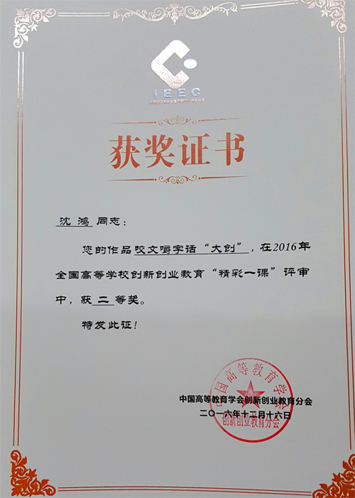 12月16日,中国高等教育学会创新创业教育分会2016年工作年会暨第七届全国高校创新创业教育高峰论坛在东北大学召开。会议总结了一年来的工作,对在全国高等学校创新创业教育工作中涌现出来的19个先进集体、83先进个人和48篇优秀论文以及创新创业“精彩一课”24 门进行表彰。其中我院教师马小龙老师主讲的课程《创业学》获得“精彩一课”一等奖,沈鸿老师主讲的课程《咬文嚼字话“大创”》获得“精彩一课”二等奖。