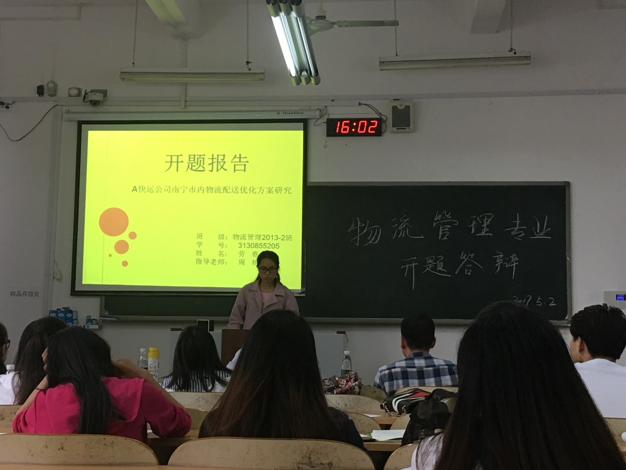 2017年5月2日下午,物流管理教研室在教9楼9312、9316教室组织2017届毕业生进行开题答辩。本届物流管理专业毕业生总计78人(含留学生1人),开题答辩学生为33人,占毕业生总人数的比例为42%,其他学生全部到场旁听了开题答辩过程。开题答辩分两组进行,物流管理教研室杨传喜、邱建伟、罗玫、张倩、赵昱、李光等老师为答辩评委老师。首先带队秘书李光老师宣布了答辩规则:答辩学生进行3-5分钟的论文选题陈述,讲解自己的研究思路及后续论文研究方案和存在问题,答辩老师针对学生选题存在问题及论文框架合理性进行提问并提出建议。在答辩规则的指导下,整个答辩过程井然有序开展。通过此次开题答辩,为2017届毕业生做好论文研究工作奠定了基础。