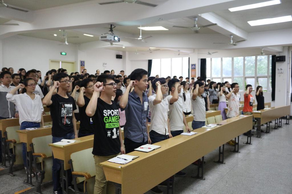 大会伊始,沈老师从为什么要学习习近平总书记系列重要讲话、如何学习习近平总书记系列重要讲话、如何用讲话精神指导学习与生活这三个方面给毕业生党员们上了一堂题为《一以贯之,务本开新——习近平寄语青年》的党课。课上,沈老师对毕业生党员们叮咛嘱咐:习近平总书记对当代青年寄予了殷切期望。我们大学生党员唯有勇担历史责任,在未来的工作岗位上继续以党员的标准严格要求自己,努力创造新业绩,用激昂奋斗的青春建设祖国、回报祖国,为党旗增辉,为母校增光。随后,沈老师和与会毕业生党员一起观看了廉政警示录像——《打铁还需自身硬》,强调我们的毕业生党员在未来工作中要进一步提高思想认识,把党纪党规落实到工作和日常生活中,不论在什么岗位上都不忘初心,时刻牢记党员身份,牢记为人民服务的宗旨。为了更好地重温入党初心,沈老师带领与会毕业生党员一起大声宣读入党誓词。毕业生党员们纷纷表示:一定要在未来学习、工作和生活中处处创先争优,争做一名合格党员,让母校以我为荣。