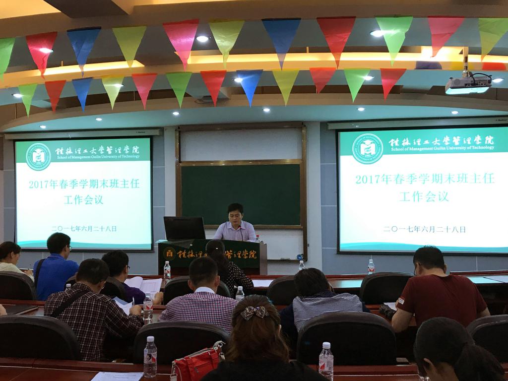 为保障2017年春季学期末各项工作的顺利开展,促进班主任、辅导员教育、管理合力形成,不断提高我院学生工作水平与质量。6月29日晚,我院于7307教室召开班主任工作会议,学院党委书记周章明,副院长李超玲以及学院14、15、16级班主任、辅导员参加会议,会议由学院党委副书记张瑞主持。