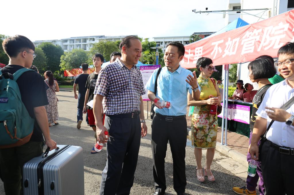 9月9日下午,我院党委书记周章明、院长连漪、副院长蒙永亨、副书记张瑞、副院长李超玲等一行人来到迎新现场,视察和指导2017级新生迎新工作,并亲切慰问迎新工作人员。在迎新处,我院领导详细地询问新生报到、入住等情况,充分肯定了奋战在新生报到一线的辅导员、迎新工作人员和志愿者的出色工作,不时叮嘱要热心细致做好迎新各项工作,确保新生顺利入住。