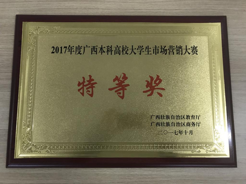 2017年10月15日,由广西教育厅、商务厅联合主办,广西财经学院承办,广西商业经济学会协办的“2017年度广西本科高校大学生市场营销大赛决赛”在广西财经学院相思湖校区圆满落幕。大赛吸引了全区24所高校共180余支队伍参加,我校和来自广西外国语学院、梧州学院、广西师范学院、南宁学院、百色学院、广西财经学院、河池学院、桂林电子科技大学9所高校的15支队伍成功入围决赛。最终,由我院李超、吕卉老师指导,市场营销专业易冠华、田苗、李盛崇3位同学协作完成的《螺霸王品牌战略营销策划》在决赛15支队伍中夺得特等奖。