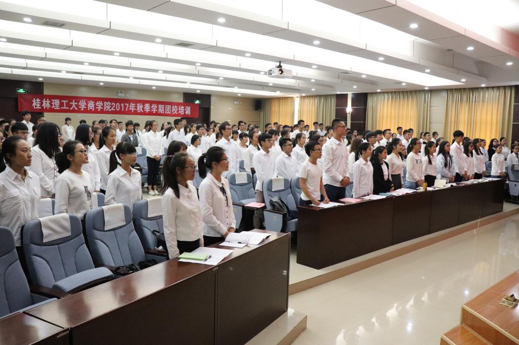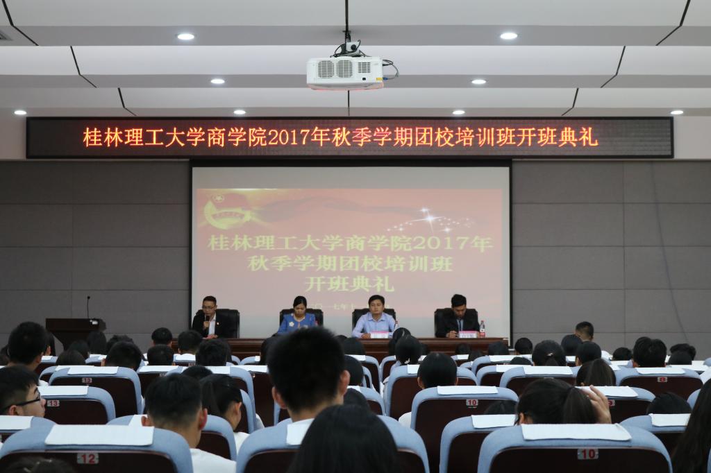 为贯彻落实团中央关于开展“青年马克思主义者培养工程”和“大学生骨干培养计划”的精神以及团校培养青年、教育青年、服务青年的工作要求,同时,贯彻和落实党的十九大相关精神,切实加强我院学生干部队伍建设,引导学生干部健康成长,增强学生干部的责任意识、服务意识和创新意识,提高学生干部的政治素质和工作能力,更好地发挥学生干部的桥梁纽带作用。我院于11月7日在雁山校区逸夫楼01501报告厅举办了商学院2017年秋季学期团校培训班开班典礼,学院党委副书记张瑞、团委副书记曾丽萍、团委学生会指导老师白宇航出席了本次开班典礼。商学院团委学生会、励合社、易班工作站暨传媒中心、学生社区服务管理中心的2017级共计186名学生干部参加了本次开班典礼。开班典礼由学生会主席席典鹏主持。