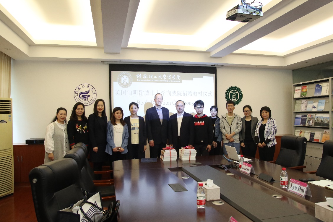 会议中,连院长首先对二位来宾的到访表示热烈欢迎,并简单介绍了我院近年来为提升市场营销2+2办学质量所做的努力,包括人才培养方案优化和师资引进等,Keith 副校长和Annie副部长也表示将从资源共享、师资交流等方面提供大力支持,共同促进项目的办学水平。随后双方就未来2+2合作办学的相关事宜交换了意见。之后,在市场营销专业教师和市场营销BCU2016级学生代表的见证下,Keith副校长代表BCU向我院捐赠了20册市场营销类教材,连院长代表我院向BCU授予了捐赠证书。最后,在专业教师的陪同下,Keith 副校长和Annie副部长来到课堂与市场营销BCU2016级学生开展了面对面的交流,Keith副校长鼓励学生们在校期间要学会利用学校的优质资源,努力学习,开拓视野,获得人生的成功。