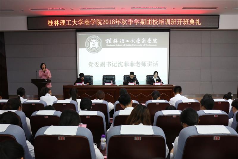 为提高我院学生干部政治素质和工作能力,帮助18级学生干部又好又快地成长,我院于11月17日晚在雁山校区逸夫楼报告厅举行2018年秋季学期团校培训开班典礼,学院党委副书记沈菲菲、团委、学生会指导老师白宇航、学生社区服务管理中心指导老师杨继理出席本次开班典礼。商学院团委、学生会、励合社、易班工作站暨传媒中心、学生社团服务管理中心、博雅人文社2018级成员共184人参加本次开班典礼。开班典礼由学院学生会主席雷丽钦主持。