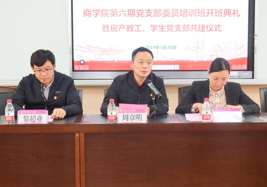 2019年4月30日下午,我院于屏风校区教10栋301教室举行商学院第六期党支部委员培训班开班典礼暨房产教工、学生党支部结对共建仪式。商学院党委书记周章明、党委副书记沈菲菲、副处级党建组织员黎超业及学院教工、学生党支部全体支委一同出席了本次开班典礼暨结对共建仪式。会议由党校教务员何邓睿老师主持。