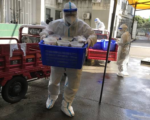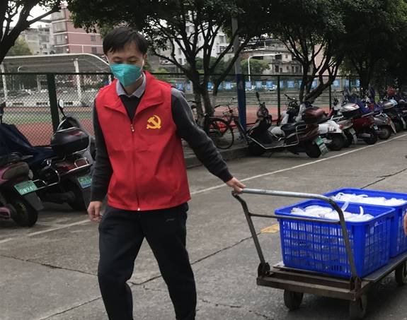 在这场没有硝烟的战争中,作为一名老党员,他虽有眼疾,但心如明镜。最初向党支部征集志愿者报名时,他的支部书记说“丁庆老师的视力非常不好,有着高度近视,行动会很不方便,虽然家住屏风校区,能不能这一次志愿活动就暂时先不报他了”。然而在疫情防控的第一天,我们却意外发现了他的熟悉身影。因为高度近视的原因,他的行动虽格外谨慎,但是他的每一步都走得无比坚定,每一眼都看得异常仔细,特别是在穿着密不透风的防护服、戴着防护帽和护目镜的时候,他更看不清眼前的东西,生怕看漏了份数导致学生没有饭吃,甚至有时候在送餐时经常脸都贴到门上了......