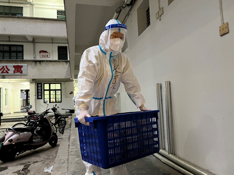 黄维老师穿着厚厚的防护服弯腰抬果篮