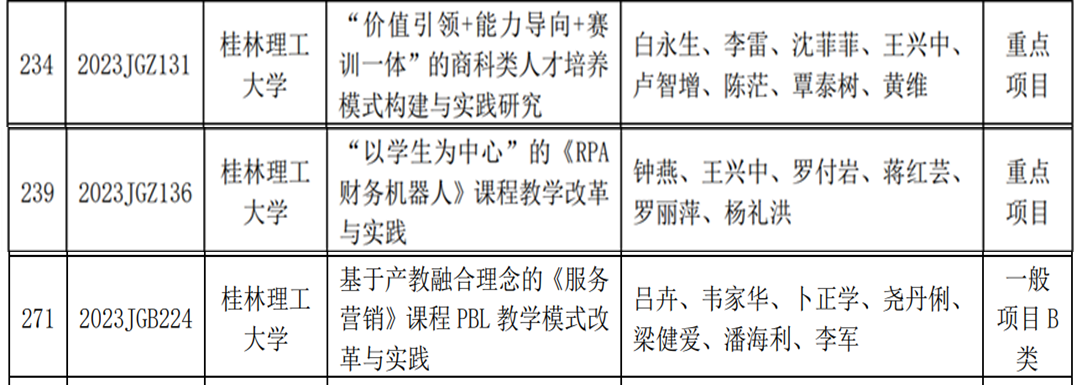 近日,广西教育厅印发《自治区教育厅关于公布2023年度广西高等教育本科教学改革工程项目的通知》(桂教高教〔2023〕24号),我院获批2项目重点项目,1项一般项目B类。其中我院白永生教授主持的《“价值引领+能力导向+赛训一体”的商科类人才培养模式构建与实践研究》、钟燕老师主持的《“以学生为中心”的《RPA财务机器人》课程教学改革与实践》获重点项目,吕卉老师主持的《基于产教融合理念的《服务营销》课程 PBL 教学模式改革与实践》获一般项目B类。
