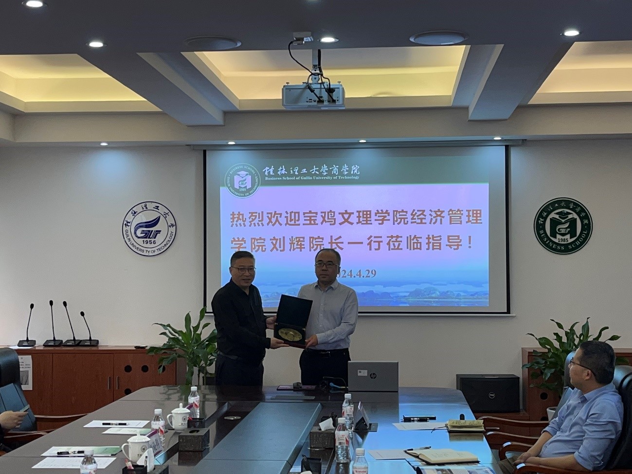 座谈会上,李雷简要介绍了我校基本情况和我院发展历史、总体情况,并介绍了学科建设、科研、合作办学和产教融合等方面的情况,指出学院正秉持“四个突出”的办学理念,遵循“新商科+学校传统优势特色学科”的办学思路,强化特色凝练,着力建设具有桂工特色的新商科。刘辉简要介绍了宝鸡文理学院及经济管理学院的基本情况,提出了研究生教育、合作办学等方面的交流意向。随后,双方参会人员就研究生培养、课程建设、合作办学等方面进行了充分的交流并互赠纪念品。