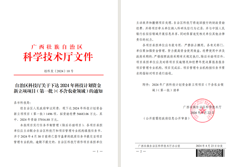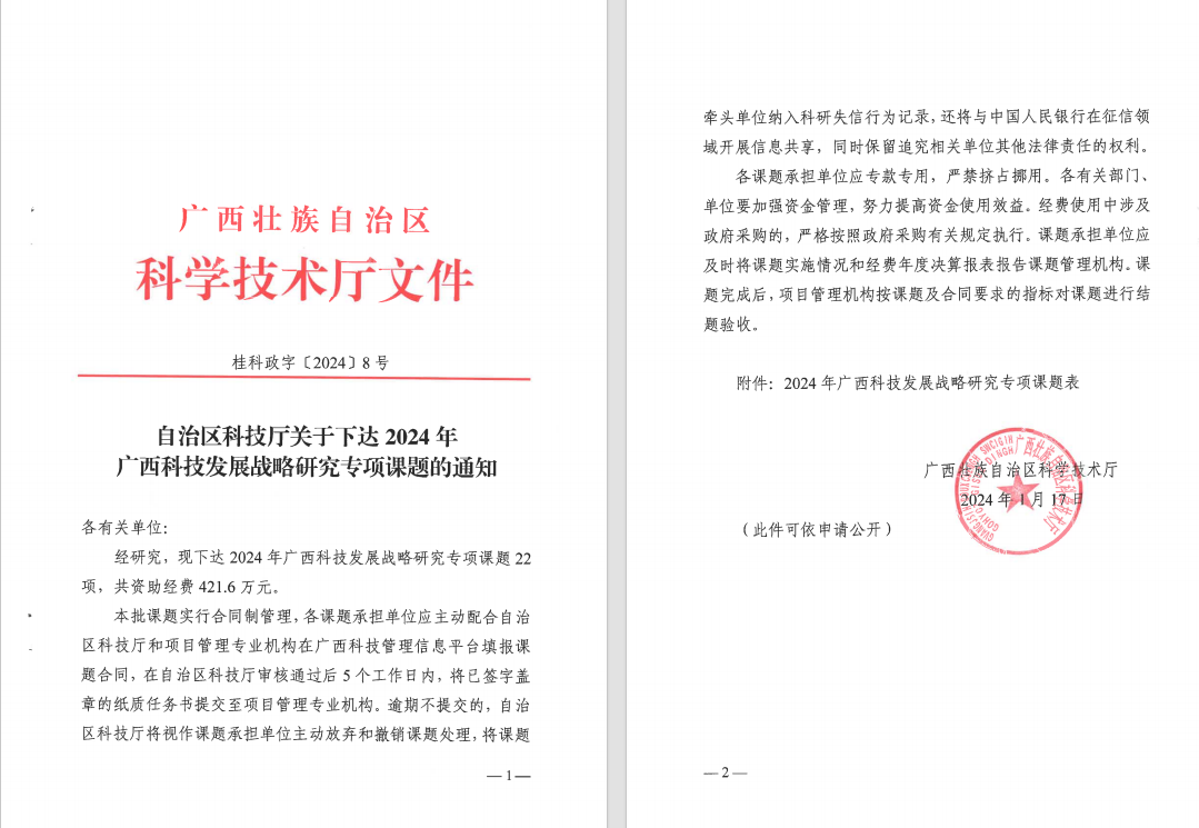 近日,广西科学技术厅公布了《关于下达2024年广西科技发展战略研究专项课题的通知(桂科政字〔2024〕8号)》 和《自治区科技厅关于下达 2024 年科技计划资金新立项项目(第一批)(不含农业领域)的通知》(桂科发[2024]10号),我院老师获批5项,其中广西自然科学基金面上项目3项,广西科技发展战略研究专项2项,并作为联合申报单位获批广西科技发展战略研究专项1项,共获得资助经费81.84万元,科技厅项目立项数和获批经费数均为历史新高,具体立项名单附后。