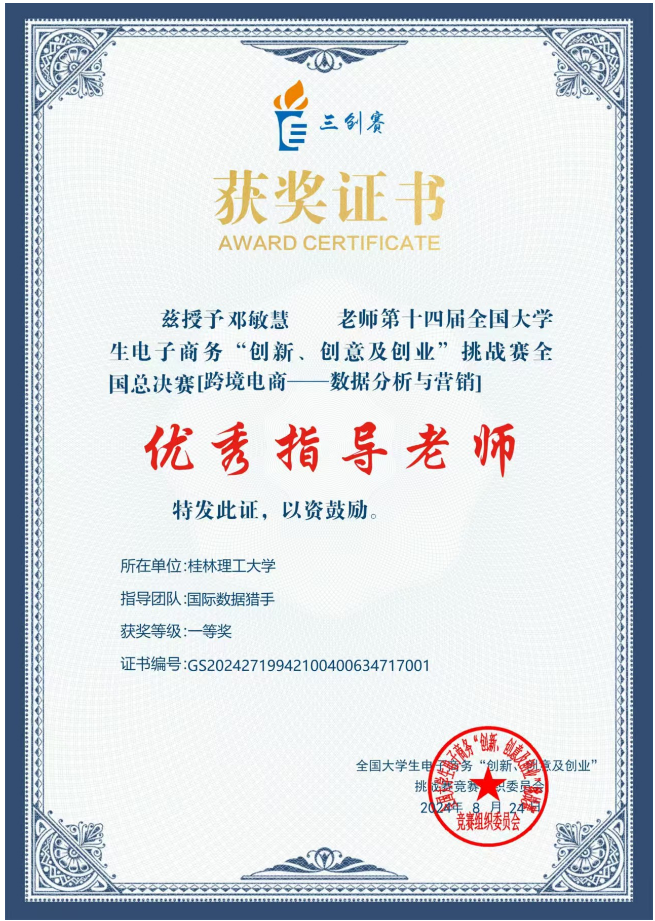 第十四届全国大学生电子商务“创新、创意及创业”挑战赛全国总决赛于2024年8月2日圆满落下帷幕。本届比赛全国报名参赛的队伍共有18万支,我校共选拔了6支队伍参赛。其中邓敏慧副教授、黄远良博士、宁忠总经理(企业导师)指导的作品“数智引领探索电商新蓝海——以跨境电商厨房家居产业为例”经过校赛、省赛选拔,以广西赛区跨境电商数据分析与营销赛道第一名的好成绩成功晋级全国总决赛。并最终获全国总决赛一等奖,三位指导老师同时获得该赛事全国总决赛优秀指导老师。