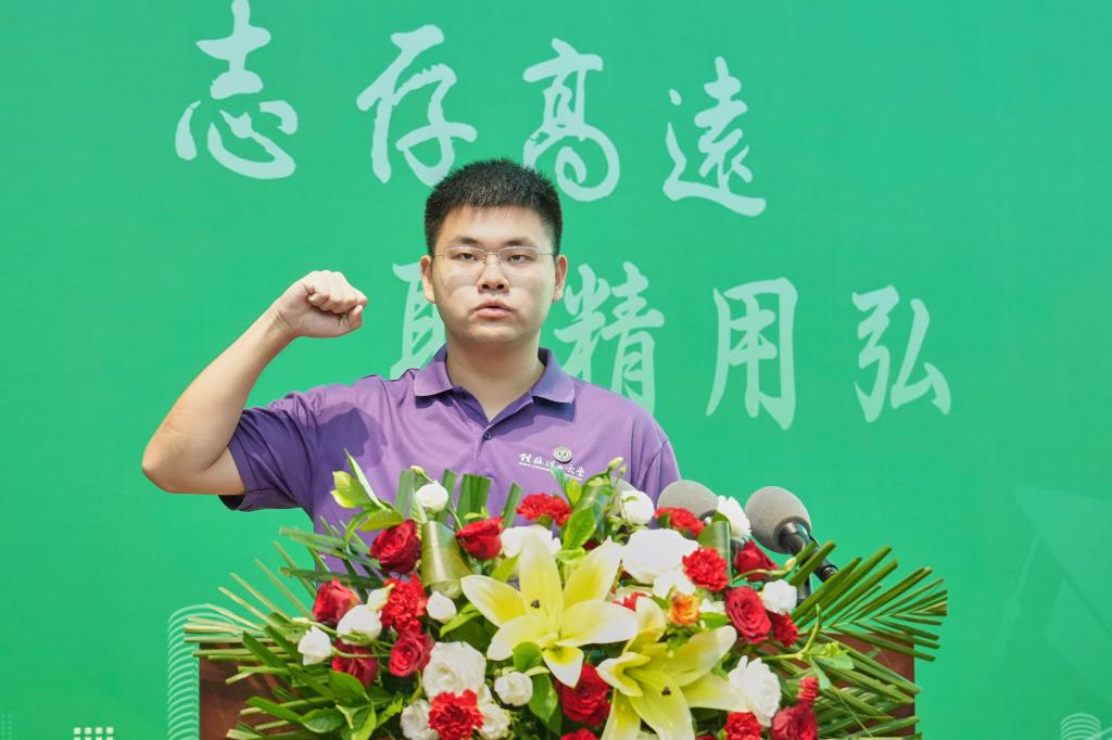 曾繁荣为新生代表佩戴院徽并授院旗,全体研究生新生庄严而神圣地将院徽佩戴在左胸前。新生代表、应用经济学2024级硕士研究生野程雷带领全体2024级研究生进行入学宣誓。
