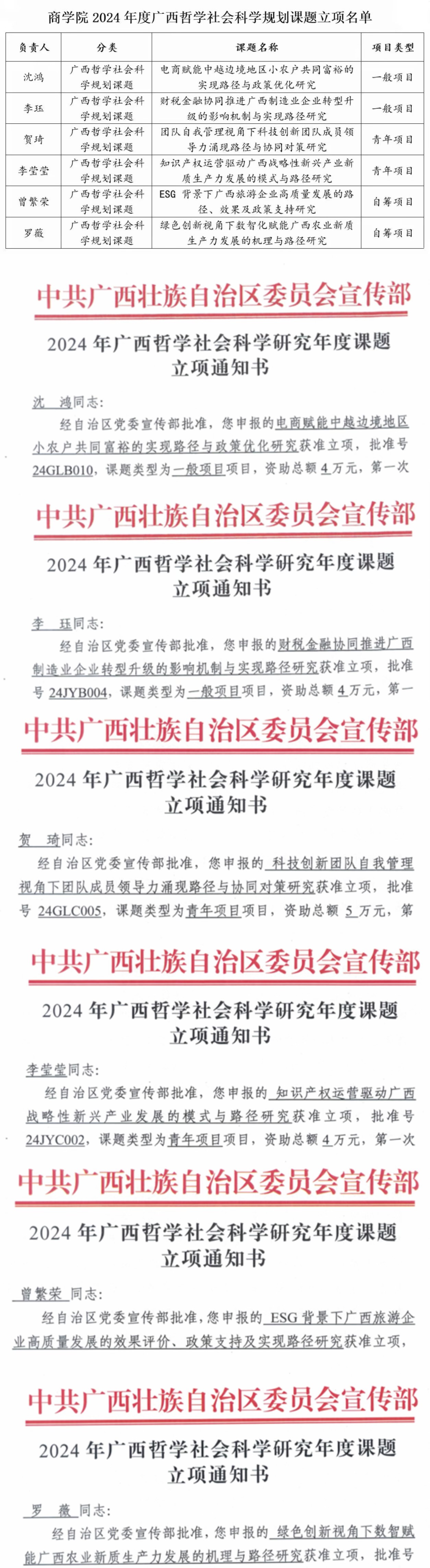 近日,广西壮族自治区哲学社会科学规划办公室正式公布了2024年度广西哲学社会科学规划课题立项名单,我院沈鸿教授申报的“电商赋能中越边境地区小农户共同富裕的实现路径与政策优化研究”等6个项目获批立项,其中一般项目2项,青年项目2项,自筹项目2项。(具体名单附后)