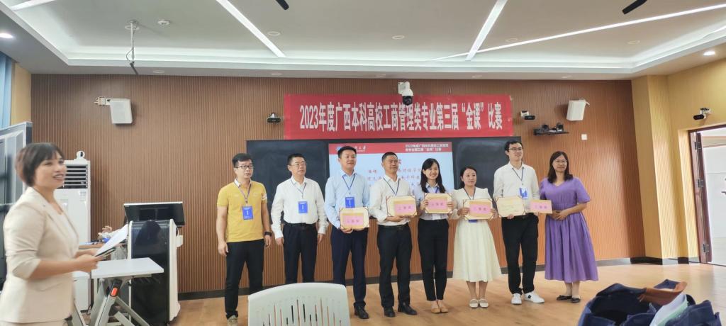 10月28日,由广西本科高校工商管理类教学指导委员会主办的2023年广西本科高校工商管理类“金课”比赛现场决赛在北部湾大学举行。本次比赛分为网评初选和现场决赛两个阶段。我院选派的邓敏慧、邱建伟两位老师经过网评初选和现场决赛,最终分别获得第三届广西本科高校工商管理类“金课”比赛二等奖、三等奖。