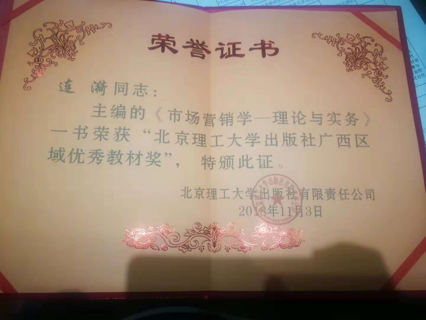 2018年11月3-4日,北京理工大学出版社广西区应用技术型大学资源建设研讨会在南宁召开。我院院长连漪教授编著的《市场营销学—理论与实务》荣获本次大会优秀教材奖第一名。