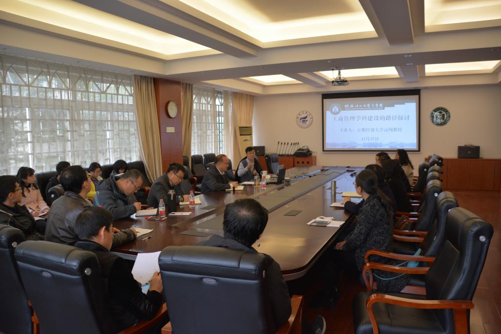 为深入推进我院工商管理学科建设和博士点申报工作,2017年12月27日上午首都经济贸易大学博士生导师高闯教授应邀来我院做了题为《工商管理学科建设的路径探讨》的学术报告,学院党政领导班子成员、教研室负责人及学院教师到场聆听报告。