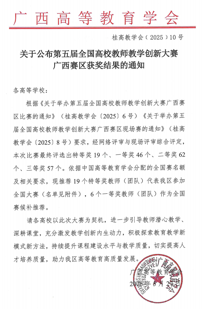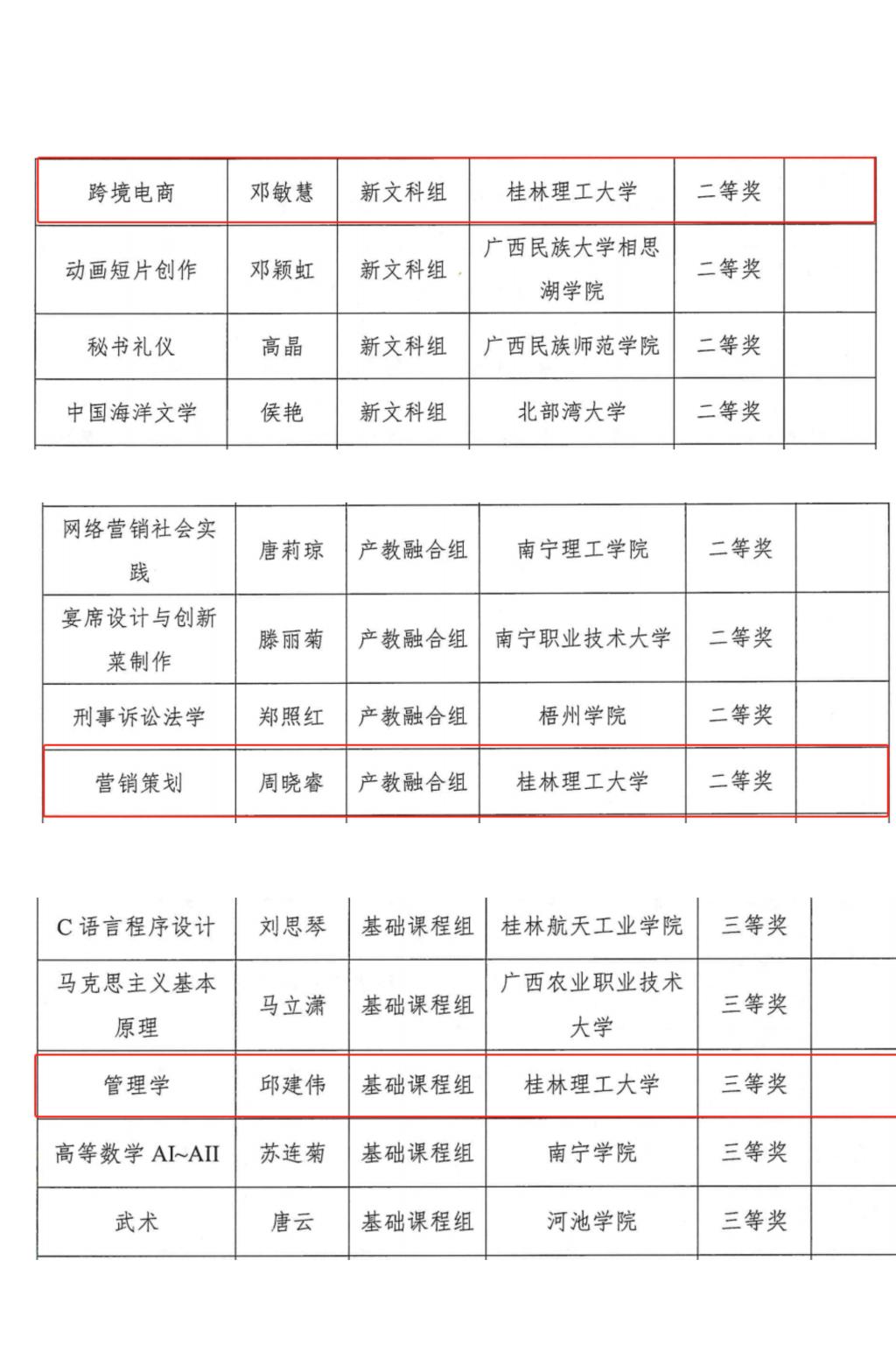 近日,广西高等教育学会公布第五届全国高校教师教学创新大赛广西赛区获奖结果,我院教师团队在本届大赛中表现优异,3支参赛团队全部获奖,邓敏慧老师团队荣获新文科赛道二等奖,周晓睿老师团队荣获产教融合赛道二等奖,邱建伟老师团队荣获基础课程赛道三等奖,获奖数量创学院历史新高。