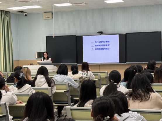 蒋玉凤副教授以“明晰方向、高效备考”为核心,从“考公考编的价值认知”“全周期备考策略”“精准岗位选择”三大模块展开系统讲解,帮助大家更清晰地了解信息获取、备考策略制定等内容,助力认清公考形势,更好地掌握科学备考方法。