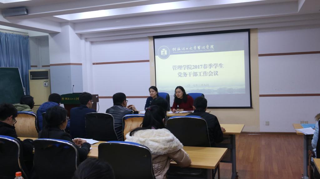 新学期伊始,为确保我院学生党务工作顺利开展,3月9日晚上19:00,我院在屏风校区7309教室召开了2017年春季学期学生党务干部工作会议。学院学工组长沈菲菲老师、辅导员兰晓航老师、学院各学生党支部书记以及全体党务中心干部出席了本次会议。