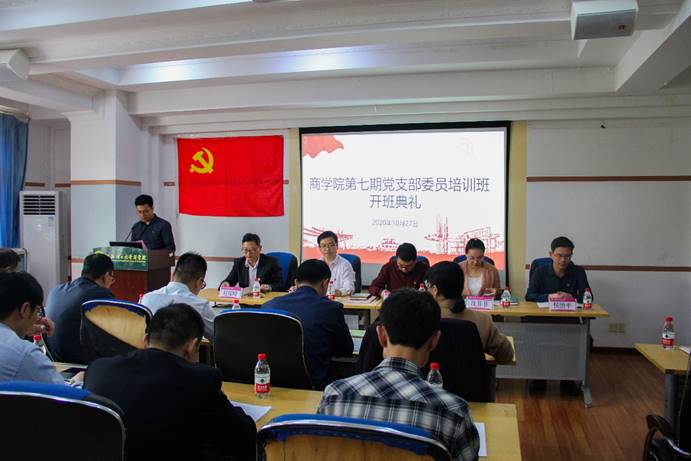 2020年10月27日下午,我院于屏风校区教7栋309教室举行商学院第七期党支部委员培训班开班典礼。学院党委委员及教工、学生党支部委员出席了本次开班典,会议由党校教务员黄维老师主持。