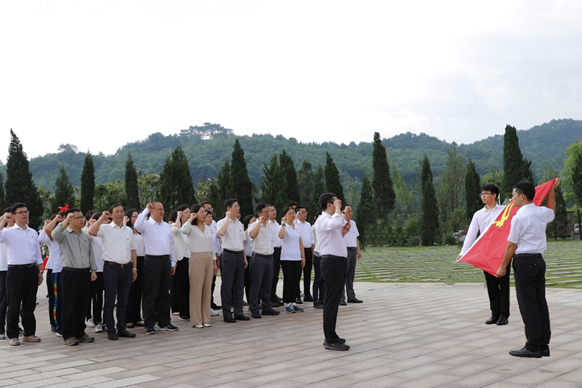 活动第一站,全体成员来到全州县湘江战役纪念园,讲解员的介绍使在场的党员同志们深刻了解到革命先烈们不求回报、不求歌颂,为保卫家园,向死而生,将自己的青春融入了祖国的山河,可谓“一草一木一忠魂,一山一石一丰碑”。学院党委书记白永生与大家共同瞻仰红军烈士碑园群雕像,表达了对红军烈士的崇高敬意和深切缅怀。随后,带领全体人员重温入党誓词。