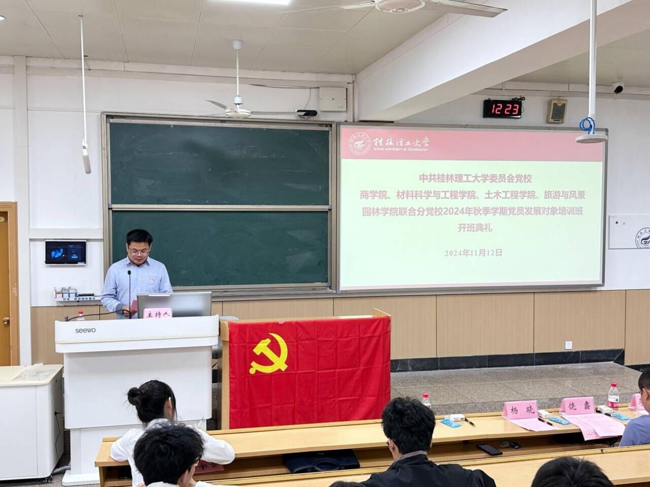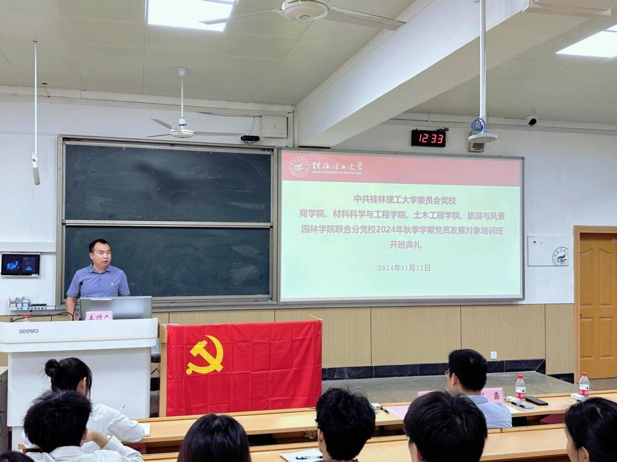 为深入学习贯彻落实习近平新时代中国特色社会主义思想和党的二十大、党的二十届三中全会精神,11月12日中午,商学院、材料科学与工程学院、土木工程学院、旅游与风景园林学院联合分党校2024年秋季学期党员发展对象培训班开班仪式在屏风9101举行,商学院党委副书记、纪委书记饶蠡出席并讲话,土木工程学院党校教务员、六级组织员杨晓及全体发展对象参加。会议由商学院党校教务员、专职组织员梁译匀主持。