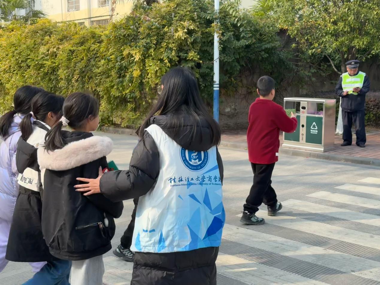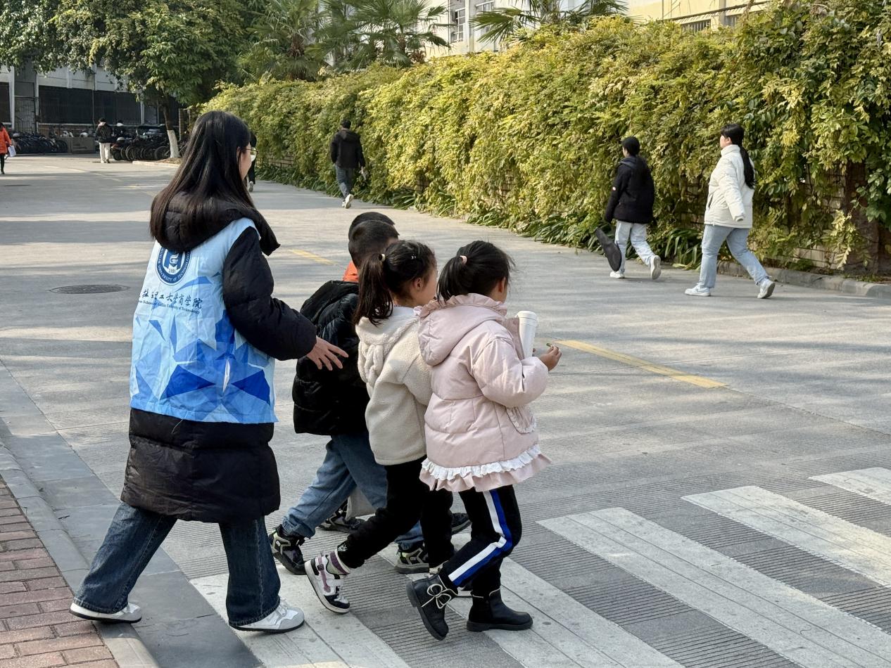 12月9日上午,在理工大学附属小学门口附近的繁忙路口迎来了一群身穿统一马甲的青年志愿者,这是来自商学院的党员志愿者,在交通高峰期,这些大学生党员志愿者们主动承担起护送小学生过马路的任务,确保孩子们的安全。