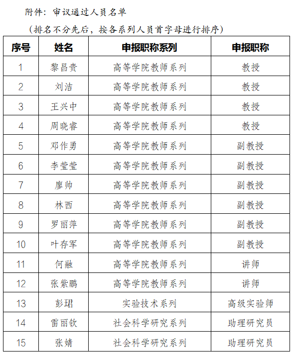 根据学校职称工作安排,学校职称审议推荐小组于2025年10月11日对申报职称人员的政治思想表现、职业道德、学历资历、专业工作经历(能力)、业绩成果等材料进行了审议。其中黎昌贵等15位同志满足本人所申报的职称评审条件,予以推荐。为充分体现“公开、公平、公正”的原则,现将审核推荐结果及个人申报材料予以公示,公示期从2025年10月14日至10月20日,材料公示地点为商学院7210室。如对所公示的人员有异议,请于2025年10月20日17:00前以书面方式向学校职改办或学校纪委或商学院党政办公室反映,书面材料请签署本人真实姓名并附联系方式。真实反映意见者受国家法律保护(根据文件规定,匿名意见不予受理)。电话:0773-5892982。