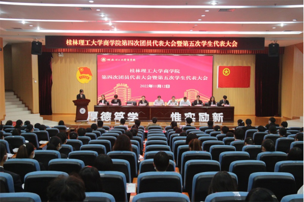 在全校上下深入学习党的二十大精神之际,11月12日下午,商学院第四次团员代表大会暨第五次学生代表大会在雁山校区图书馆报告厅顺利召开。学院党委副书记沈菲菲、校团委社团文化部副部长郭彦汝、学院团委书记宋海民、学院团委副书记覃泰树,学院学生辅导员庞如雪、雷丽钦、胡嘉议、王贤出席此次大会,学校学生会成员肖时敏、学院第三届团委、第四届学生会主席团成员及150名团员青年代表参加大会。