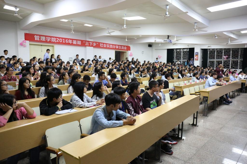 为展示我院2016年暑期“三下乡”社会实践活动成果,激发同学参与社会实践活动的积极性,管理学院于10月18日晚在屏风校区9101教室举行了2016年暑期“三下乡”社会实践活动分享交流会。我院近300名同学参加了本次交流会,学院团委副书记曾丽萍老师以及各学院社会实践部部长应邀出席了本次分享会。