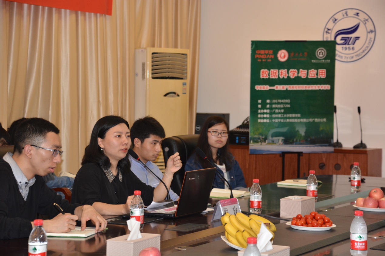 在广西平安公司的支持下,我院应广西大学商学院的邀请,联合beats365(中国区)-唯一官方网站人文社会科学学院、广西师范大学经济与管理学院、广西民族大学商学院、广西师范学院经济与管理学院共同举办广西高校财经类研究生学术论坛。应我院研究生会邀请,管理学院工程管理学博士罗玫老师于2017年4月9日晚上在屏风校区7206会议室为我院研究生作了题为“数据科学与应用”的学术讲座。