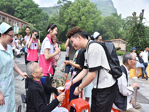 活动过程中,青年志愿者们分工合作,有序地完成会场布置工作,帮忙搀扶老人观看演出,逐一为慈祥友善的爷爷奶奶们献上感恩母亲节的爱心贺卡,帮助桂林仙源健康产业股份有限公司为老人们发放牛奶,更是耐心地走访每一间卧室,为老人们打扫卫生,整理房间,给老人发放水果。在养老院,志愿者们陪老人们一起看演出,叙家常,了解老人们的身体状况。对于行动不便、生活难以自理的老人,志愿者们则悉心的帮助他们剥水果。志愿者与老人间的互动就像素未谋面的亲人,没有丝毫的生分,还时不时地传出欢声笑语!