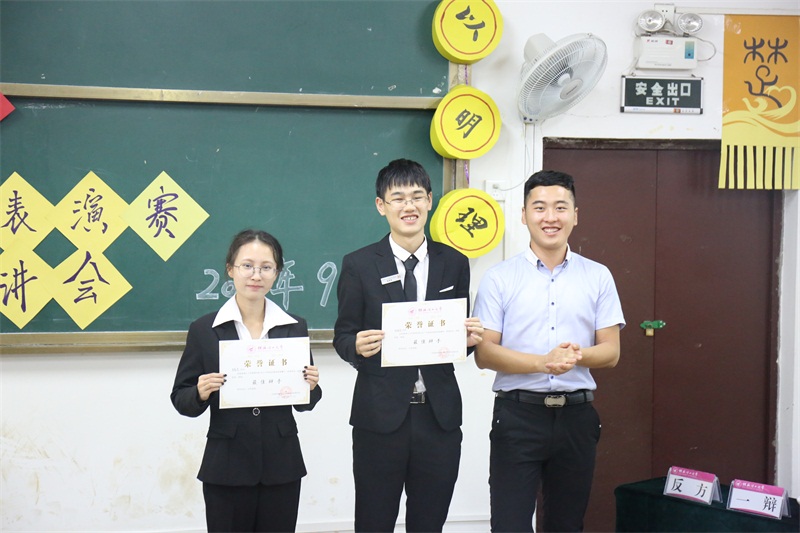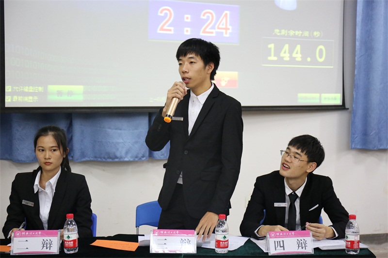 比赛伊始,学院学生会指导老师白宇航上台致辞。他先对学院辩论队以往取得的优异成绩进行肯定,随后强调辩论赛是一项锻炼思维和口才的良好方式,希望2017级的同学们抓住机遇,提升自己,并宣布管理学院2017年辩论队换届表演赛暨招新宣讲会正式开始。接下来由管理学院16级辩论队队长黄江梅辩论队招新进行宣讲。随后,双方辩手围绕“和失忆的幸福地结婚生子,现在我可以一键帮他恢复记忆,这个按钮我是拍还是不拍”这一辩题展开了展开激烈的辨论,在第一阶段的立论环节,双方一辩引经据典、思路清晰,为本次辩论赛开篇立论。在之后的盘问、驳论和攻辩环节,双方辩手灵活的思维、缜密的逻辑推理赢得观众的阵阵掌声。在最精彩的自由辩论环节,辩手们旁征博引、妙语连珠,将辩论赛推向了高潮。赛后,校辩论队王帆为本次辩论赛进行了点评,他用幽默诙谐的语调指出了双方的辩论主旨,并鼓励学弟学妹们在生活中不止要关注与自身息息相关的事,也要留意对自己有用的事。随后,由白宇航老师为反方四辩与正方三辩颁发最佳辩手荣誉奖状。至此,此次辩论赛换届表演赛暨辩论队招新宣讲会圆满结束。