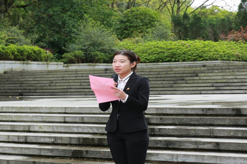 活动伊始,由校团委学生副书记谭明灿讲解本次活动的背景与目的,并宣布烈士祭扫仪式开始。奏唱国歌后,材料科学与工程学院团委书记赵思聪老师介绍了烈士英雄事迹,意在让同学们铭记历史,铭记英雄精神。接着,全员默哀一分钟,在庄严肃穆的仪式中接受精神洗礼。随后,商学院学生骨干代表王昕怡发言,她倡议当代大学生应当自觉学习革命英雄事迹,继承和弘扬爱国主义精神,为实现中华民族伟大复兴的中国梦而努力奋斗。随后,土木与建筑工程学院团委书记姚慧老师带领全体学生骨干重温入团誓词。最后,我校团委副书记莫媛老师进行讲话,她对在场的所有学生骨干指出了三点希望:一是要缅怀革命先烈,传承红色精神;二是要牢记历史使命,弘扬爱国精神;三是要胸怀远大理想,同心共筑中国梦。至此,本次清明祭扫活动圆满结束。